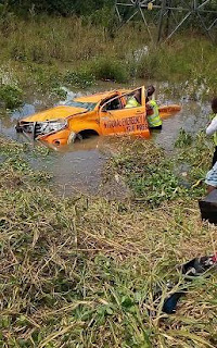 The rear tyre busted on motion and with no better option, the driver diverted into a canal. the 5 occupants escaped with minor injuries. See more photos…