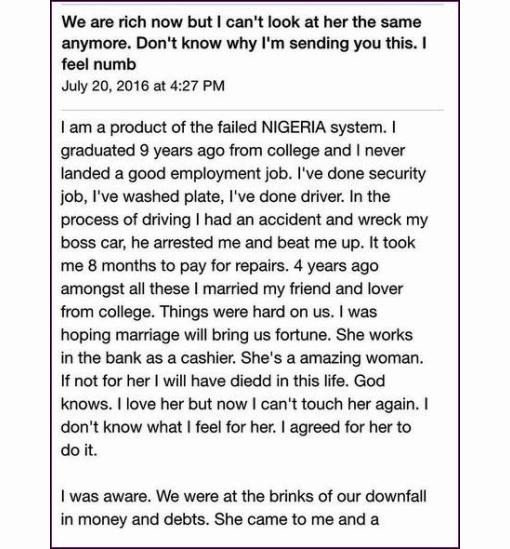 Relationship adviser and psychologist, Joro Olumofin shared the story of how a man made his wife sleep with a customer for a whooping sum of N6 million which has started to affect him psychologically.