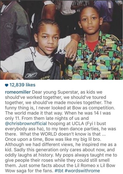 According to Lil Romeo, who Bow Wow has dissed in the past, he never saw Bow Wow as competition but rather as a big brother and he remembers all the late nights the both of them spent growing up together with Chris Brown.