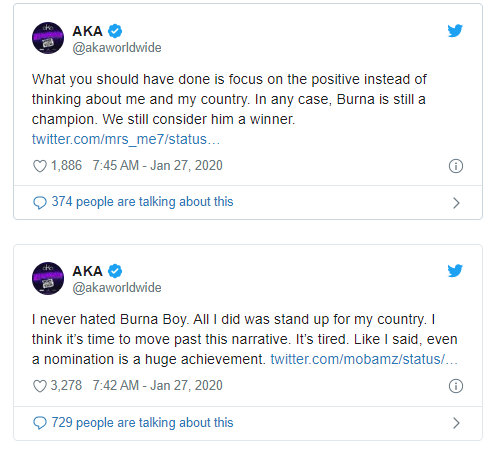 As soon as the news broke, trolls stormed AKA’s Twitter page to hear what he will say about the loss Burna Boy suffered.