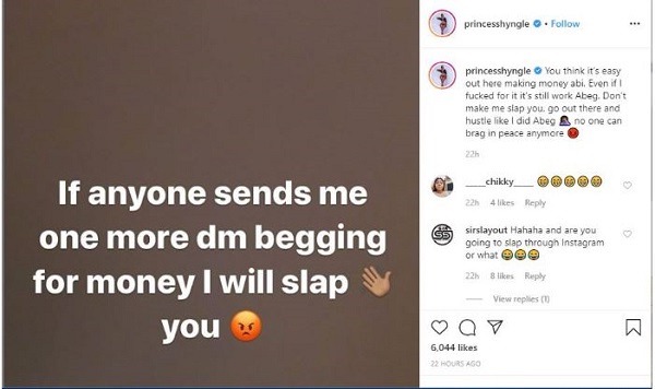She posted: “You think it’s easy out here making money abi. Even if I fucked for it it’s still work Abeg. Don’t make me slap you, go out there and hustle like I did Abeg no one can brag in peace anymore”