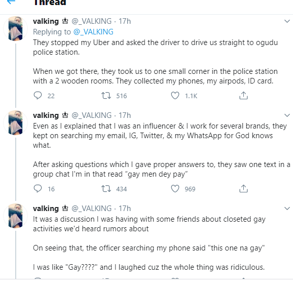 A social media user @_VALKlNG who detailed the unpalatable treatment he claimed to have had from the men of the Nigeria Police Force at Ogudu area in Lagos Yesterday.