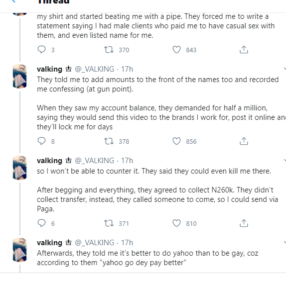 Next thing he said “you think say I dey follow you laugh”, told me to take off my shirt and started beating me with a pipe. They forced me to write a statement saying I had male clients who paid me to have casual sex with them, and even listed name for me.