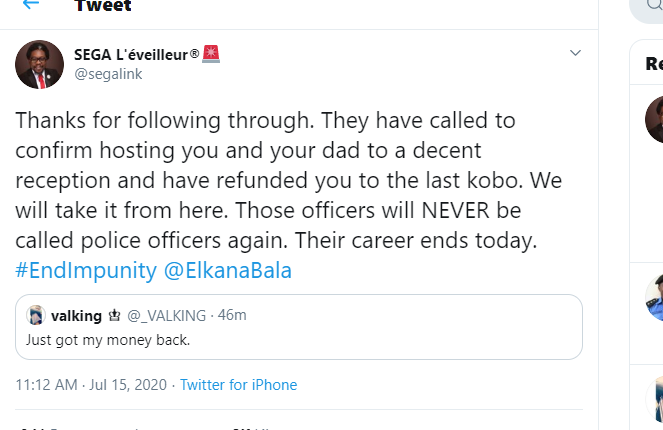 Thanks for following through. They have called to confirm hosting you and your dad to a decent reception and have refunded you to the last kobo. We will take it from here. Those officers will NEVER be called police officers again. Their career ends today. “