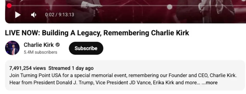 Verified figures showed 7.49 million views on Kirk’s YouTube channel, 3.8 million impressions on his X account, 2.43 million views on Fox News’ YouTube livestream, and 1.26 million on the Associated Press’ YouTube feed. These numbers exclude additional streams on Rumble, Facebook, Twitch, and replays still climbing.