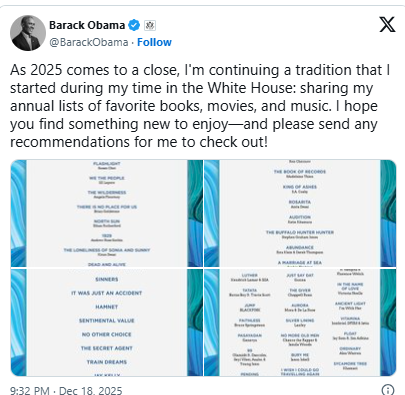 In his caption on X, he wrote: “As 2025 comes to a close, I’m continuing a tradition that I started during my time in the White House: sharing my annual lists of favorite music. I hope you find something new to enjoy—and please send any recommendations for me to check out!.””