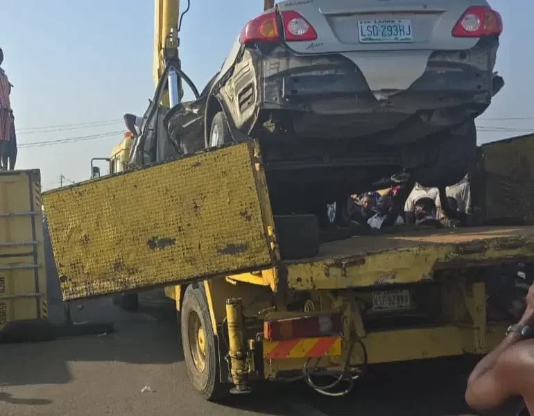 A yet-to-be-identified driver luckily escaped death on Monday morning when a 40-foot-laden container fell onto a Toyota Camry, with registration number LSR 293 HJ, at Mile...